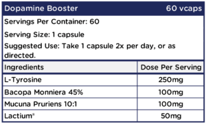 This product combines the essential ingredients Mucuna Pruriens, L-Tyrosine and Bacopa Monniera, required to increase the production of dopamine. As stress can easily convert dopamine into adrenaline, Lactium is added to reduce activity in the HPA axis, reduce the stress response and prevent this conversion. Lactium also ensures that dopamine remains bound in the prefrontal cortex where it is needed for focus, concentration and mood control.