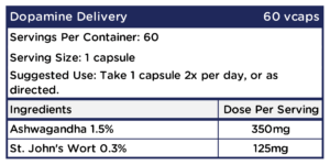 A formula designed to inhibit the reuptake of dopamine and increase its transportation to receptors. Ashwagandha and St. John’s Wort function like NDRIs (norepinephrine-dopamine reuptake inhibitors), increasing the delivery of dopamine to its target receptor without increasing the production of dopamine itself or its conversion into adrenaline. It has some mild SSRI (selective serotonin reuptake inhibitor) properties, boosting serotonin activity without increasing production, thereby avoiding the risk of serotonin syndrome.