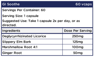 GI Soothe is a formula designed to support gastrointestinal health and maximize nutritional absorption by decreasing GI inflammation and promoting repair of the gut lining.