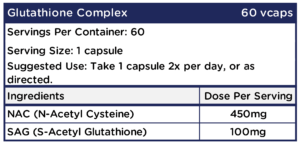 A synergistic combination of S-Acetyl-Glutathione and NAC. The acetyl group attached to S-acetyl- glutathione (SAG), protects it from degradation as it passes through the GI tract, resulting in higher stability than most forms of glutathione. It has a faster, more efficient transportation through cellular membranes, yielding a rise in serum glutathione close to 37%, more than double that of other forms of glutathione. It also produces unparalleled reduction in cytokine production and superior phase-2 detoxification. Its action is aided by the addition of NAC, which can readily pass the blood brain barrier, performing similar function in neural tissue.
