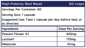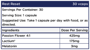 A higher-dosed Melatonin formula combined with Passion Flower and Lactium Casein Hydrolysate (Lactium). High Potency Rest Reset contains 10 mg of melatonin (compared to 3 mg in regular Rest Reset). New research indicates that the previous dosing of melatonin was far too low and higher dosing is needed to support delta-wave deep sleep, increase serotonin production, reduce inflammation, block 4-OH-estrogen receptors and support a variety of anti-cancer pathways.