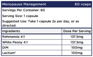 The drop in estrogen at menopause causes a rise in Kisspeptin, Neurokinin B and cortisol, which stimulate warm-sensing neurons in the preoptic area, generating hot flashes. Stimulation of these neurons also increases the activity of GnRH and LH, enhancing the hot flash symptoms. Menopause Management is a unique combination of White Peony, Rehmannia, DIM and Lactium.