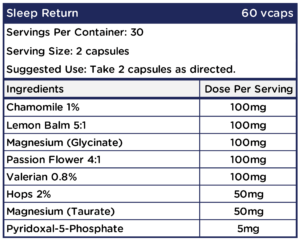 A combination of Valerian, Chamomile, Lemon Balm and Passion Flower. Sleep Return does not contain melatonin, making it ideal to take just before bed and, if needed, in the middle of the night to help you quickly return to sleep without morning grogginess. This in turn helps to reduce the stress and anxiety associated with nighttime waking, once again allowing for a better deeper sleep.