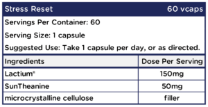 A unique combination of Lactium Casein Hydrolysate (containing bioactive peptides) and SunTheanine. Stress Reset acts to balance the nervous system and restore parasympathetic drive, rather than simply dampening the sympathetic side.
